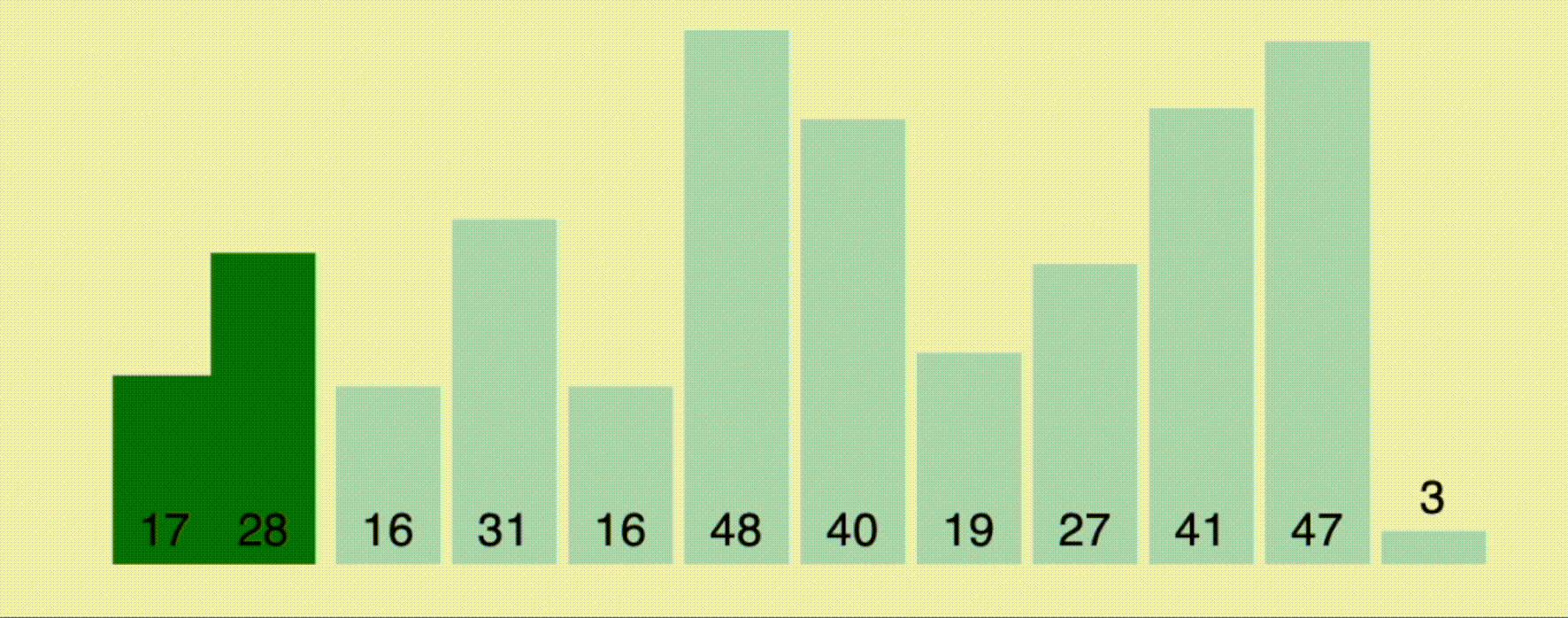 (굵은 글자는 인접한 두 개의 비교를 뜻하고, 빨간색은 자리 교환이 이루어진 것)