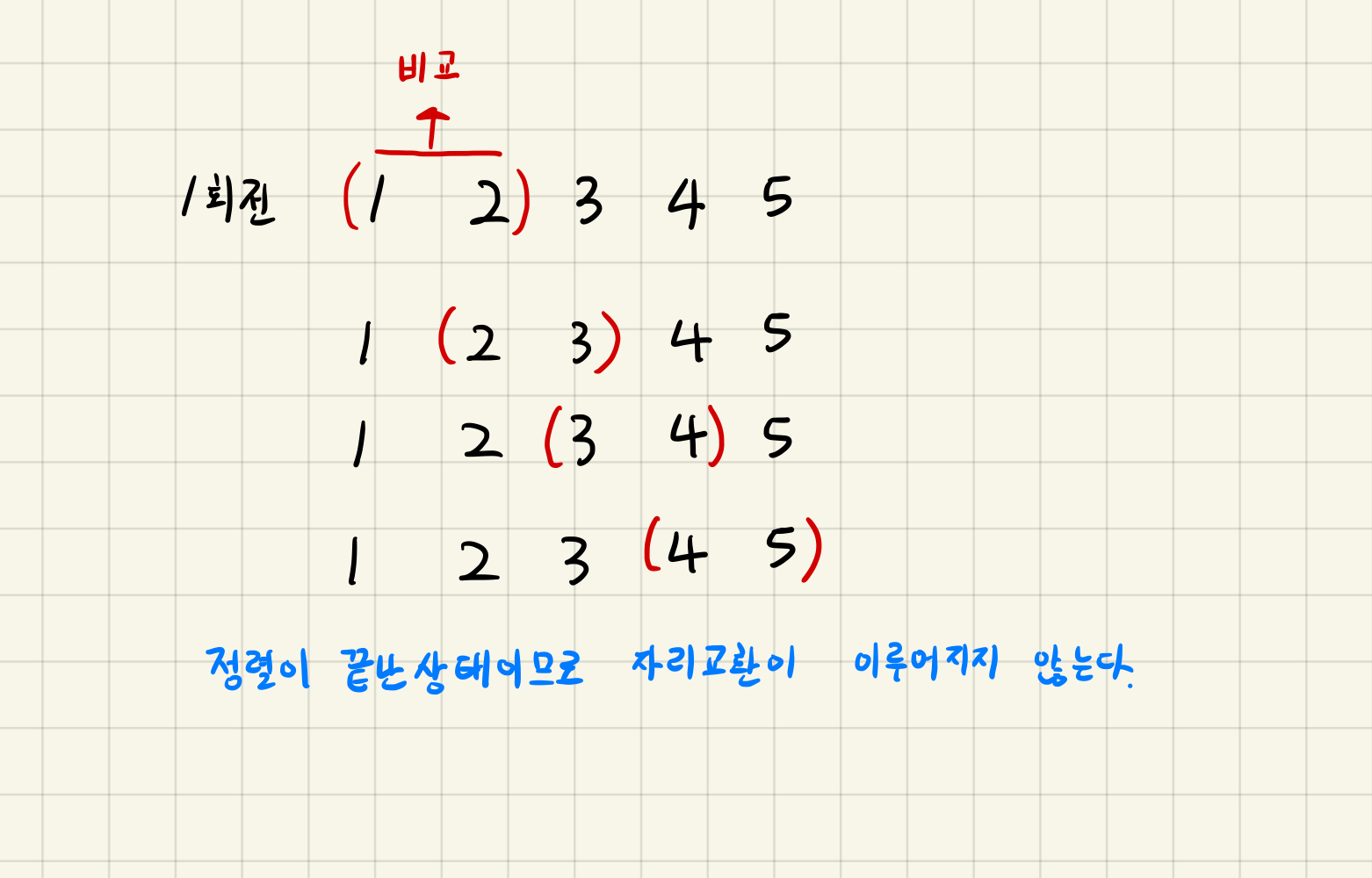 만약 위 그림처럼 {1, 2, 3, 4, 5}가 들어와서 버블 정렬을 시작하면 1회전에서 저렇게 의미없이 비교를 하게된다.