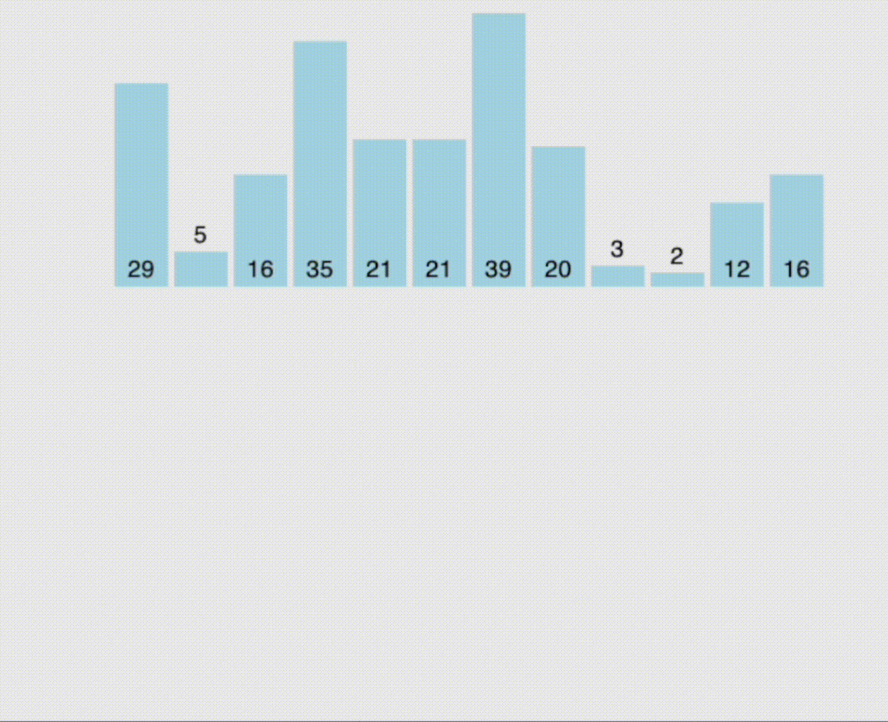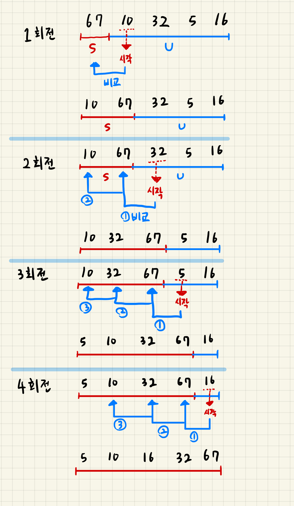 배열 [67, 10, 32, 5, 16] 이 있을 때의 과정은 아래 그림처럼 동작하게 된다.
