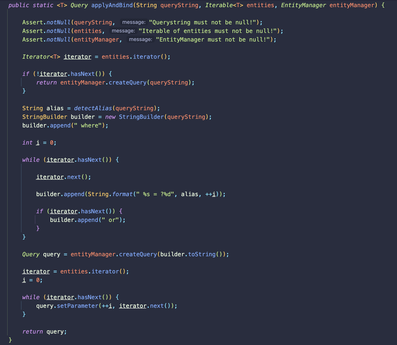QueryUtils.java에 정의되어 있는 applyAndBind는 3가지 매개변수가 있다.