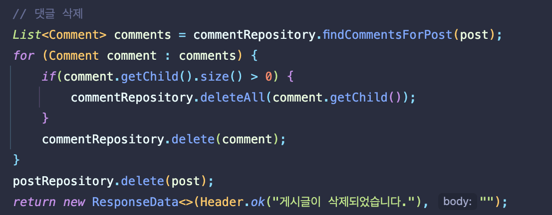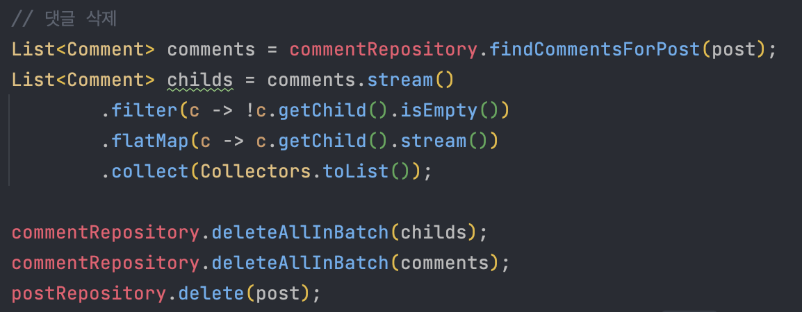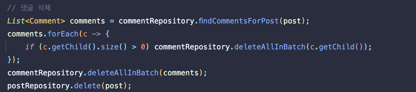 따라서 게시글에 등록되어 있는 댓글과 대댓글을 먼저 삭제하기 위해 다음 코드를 추가하였다.