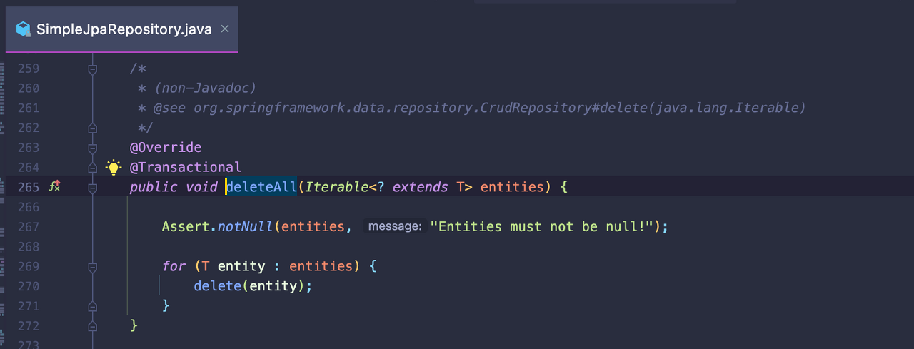 내부적으로 엔티티들을 하나씩 꺼내서 delete()를 사용하고 있다.