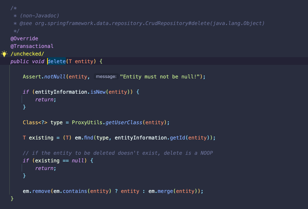 delete()는 결국 내부적으로 EntityManager의 remove()를 추가로 사용하여 제거하고 있다.
