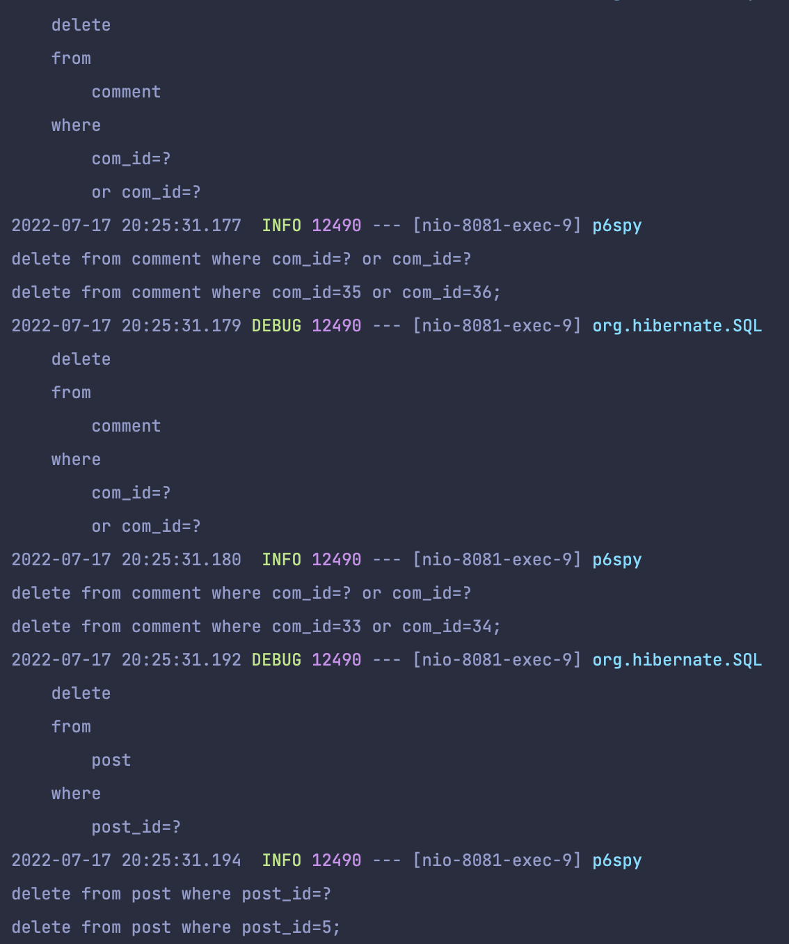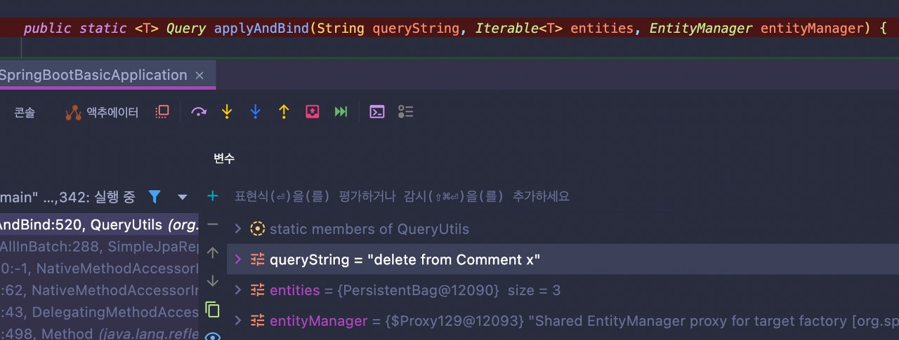 잠깐 getQueryString()을 설명하자면 이 메서드를 실행한 Comment (엔티티 이름)을 template의 문자열 형식에 맞게 넣는데 이 template은 인자로 "delete from %s x"가 들어왔기에 "%s"에 엔티티 이름이 들어가게 되어 리턴값이 저렇게 나오는 것이다.