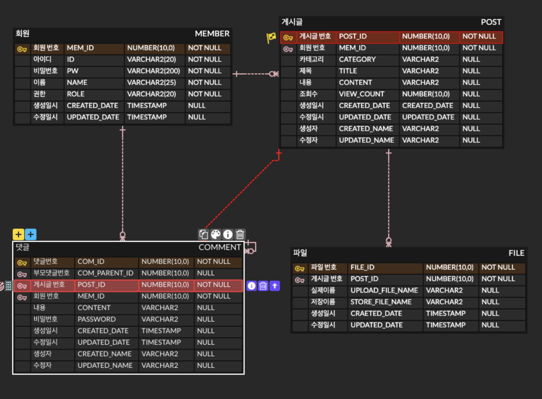 현재 댓글 테이블은 게시글의 pk(기본키)를 fk(외래키)로 가지고 있기 때문에,