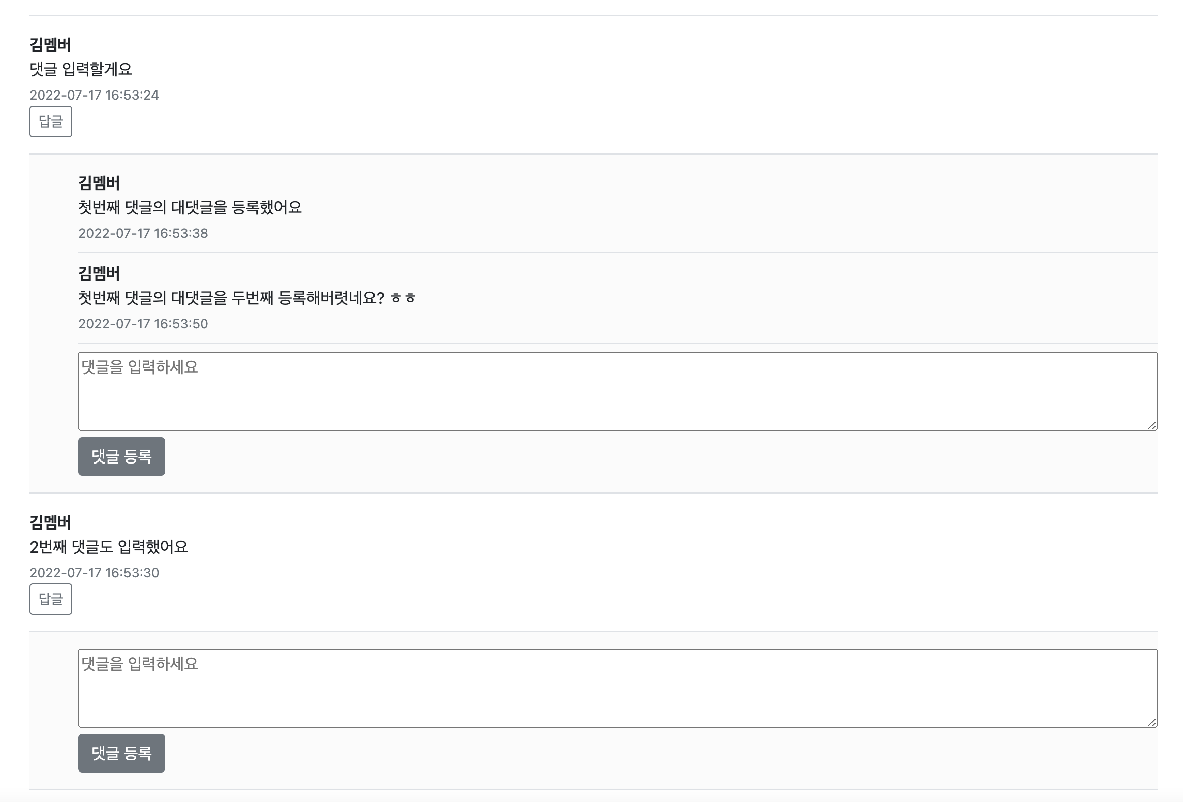 먼저 첫번째 댓글의 대댓글인 2개가 한번에 삭제되고, 그 후 댓글들이 한번에 삭제되는 것을 볼 수 있다.