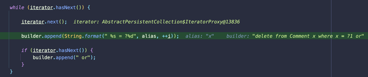 그 후 만들었던 builder 문자열에 " where"를 붙여서 "delete from Comment x where"를 만들었다.