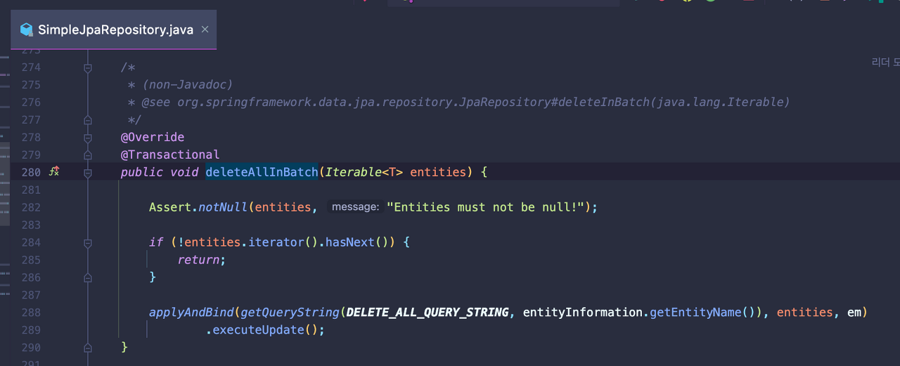 SimpleJpaRepository에 재정의되어 있는 deleteAllInBatch()는 applyAndBind()를 사용하여 쿼리를 끝낸다.