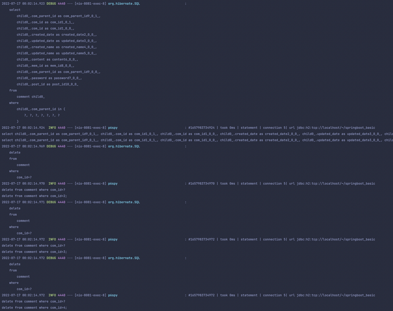 대댓글을 조회하는 쿼리를 시작으로 대댓글을 1건씩 삭제하고 있던 것이다.
