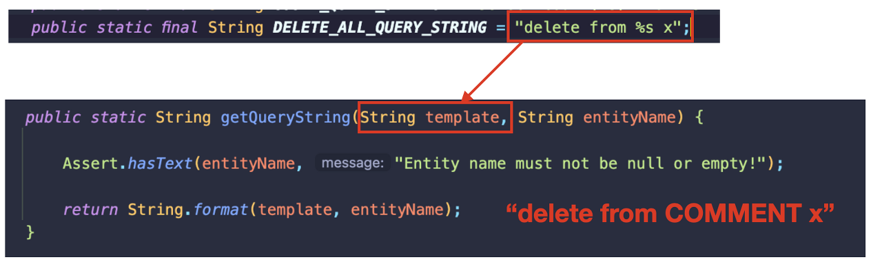 여기서 우리는 첫번째 매개변수에 getQueryString(DELETE_ALL_QUERY_STRING,entityInformation.getEntityName())이 들어갔는데 이것의 리턴값은 "delete from Comment x"이다.