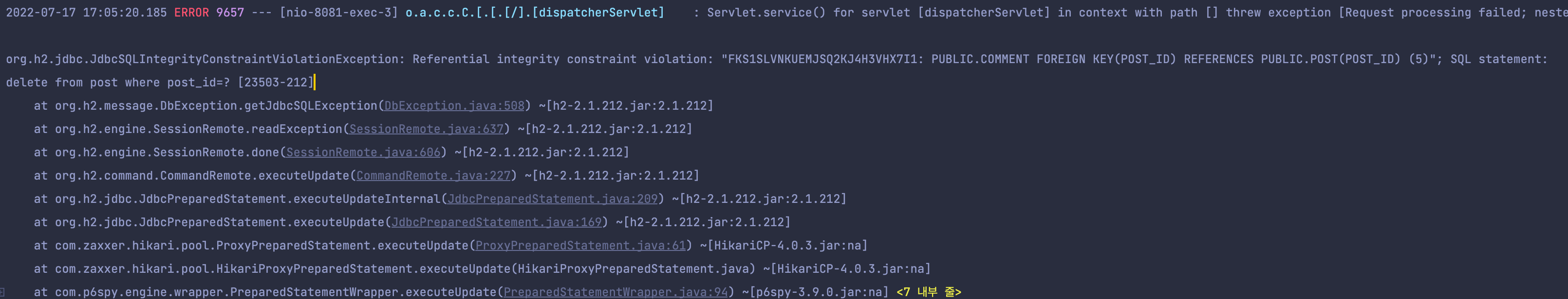 즉, POST(게시글)을 삭제하려고 하니 이 게시글을 참조하고 있는 댓글 테이블에서 참조할 수 없는 외래키 값을 가지게 되어서 발생한 상황인 것이다.