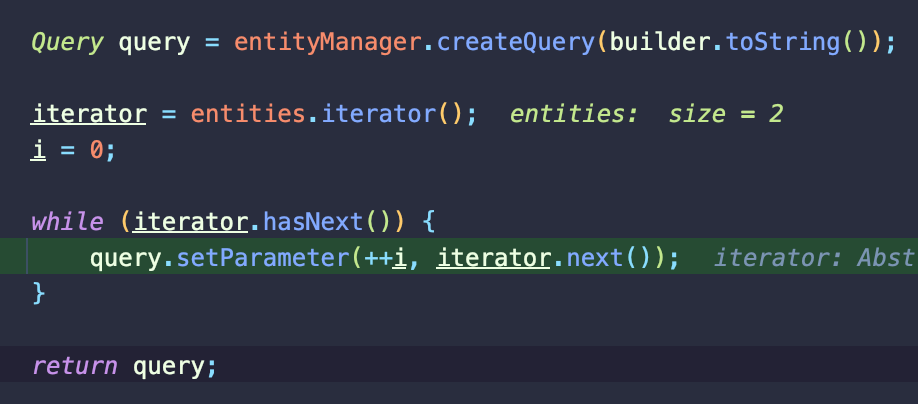 이렇게 최종적으로 만든 문자열을 EntityManager.createQuery() 메서드로 쿼리문을 만들고, 해당 번호에 맞춰서 파라미터를 넣어준다.