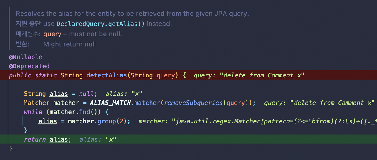 따라서 현재 위 코드에서 query는 "delete from Comment x"인데 현재 ALIAS_MATCH 정규 표현식에 매칭된 query의 2번째 그룹을 꺼내서 alias에는 "x"가 들어간다.