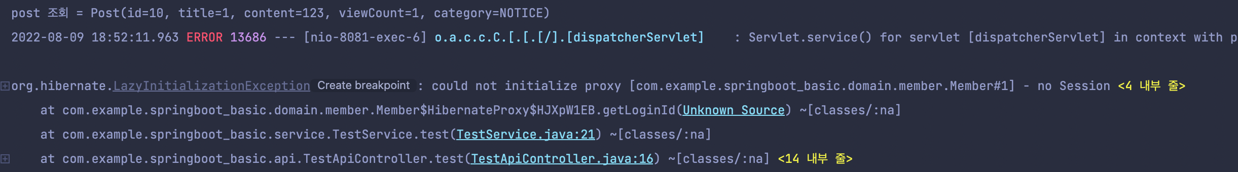 게시글 엔티티는 조회가 되었지만 지연로딩인 회원은 예외가 발생하게 된다.