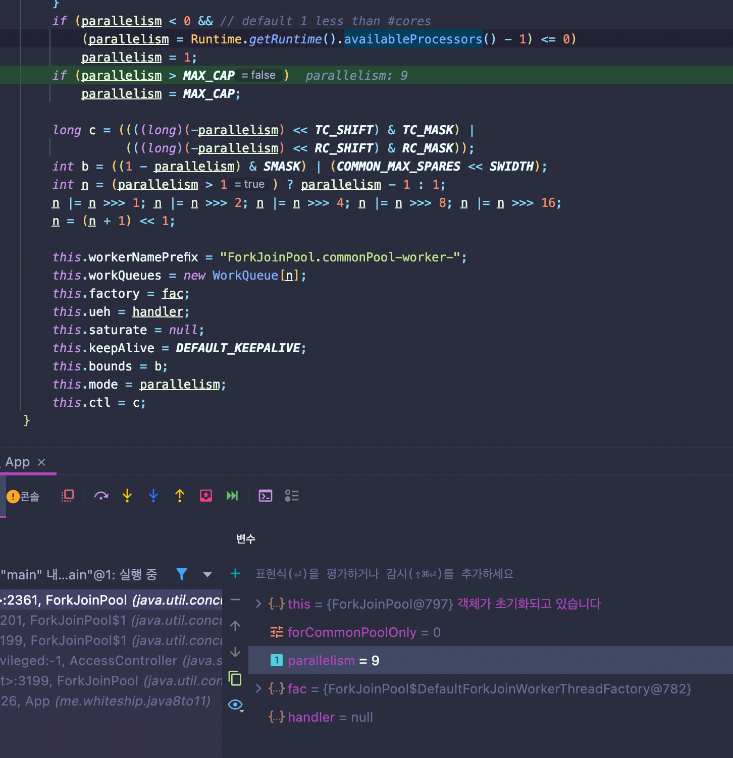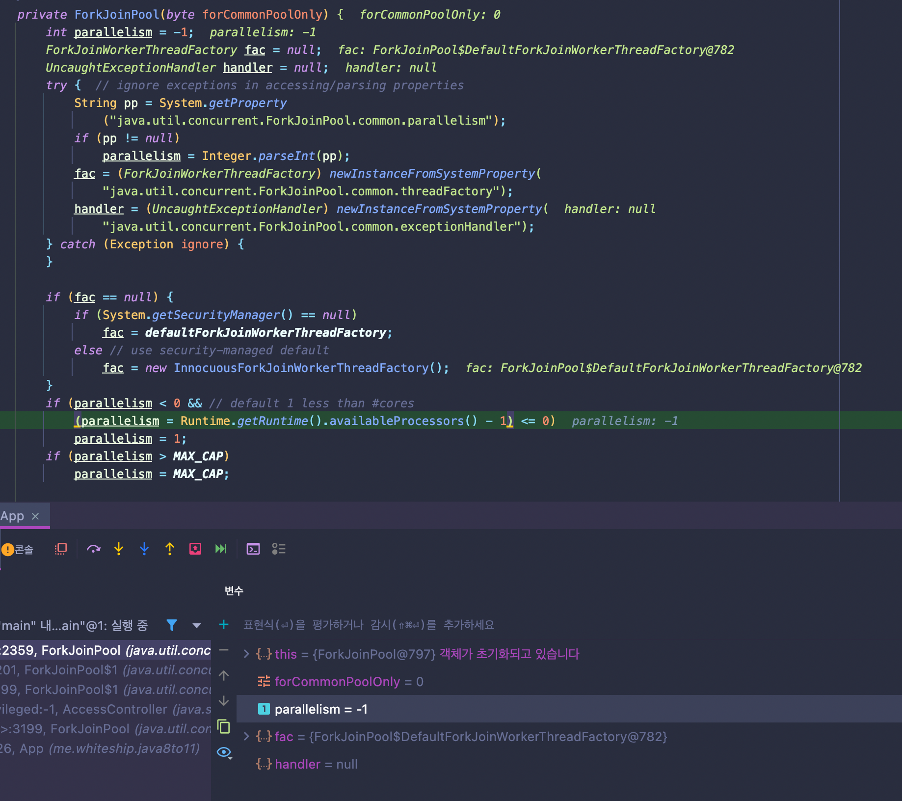 그렇다면 실제로 저 ForkJoinPool의 COMMON_PARALLELISM에 값이 어떻게 들어가는지 디버그해서 찾아보자.