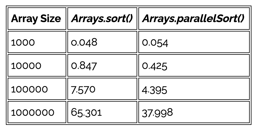 물론 값에 따라 성능차이가 다르겠지만 결과적으로 10,000부터는 parallelSort()가 성능이 더 좋다는 것이다.