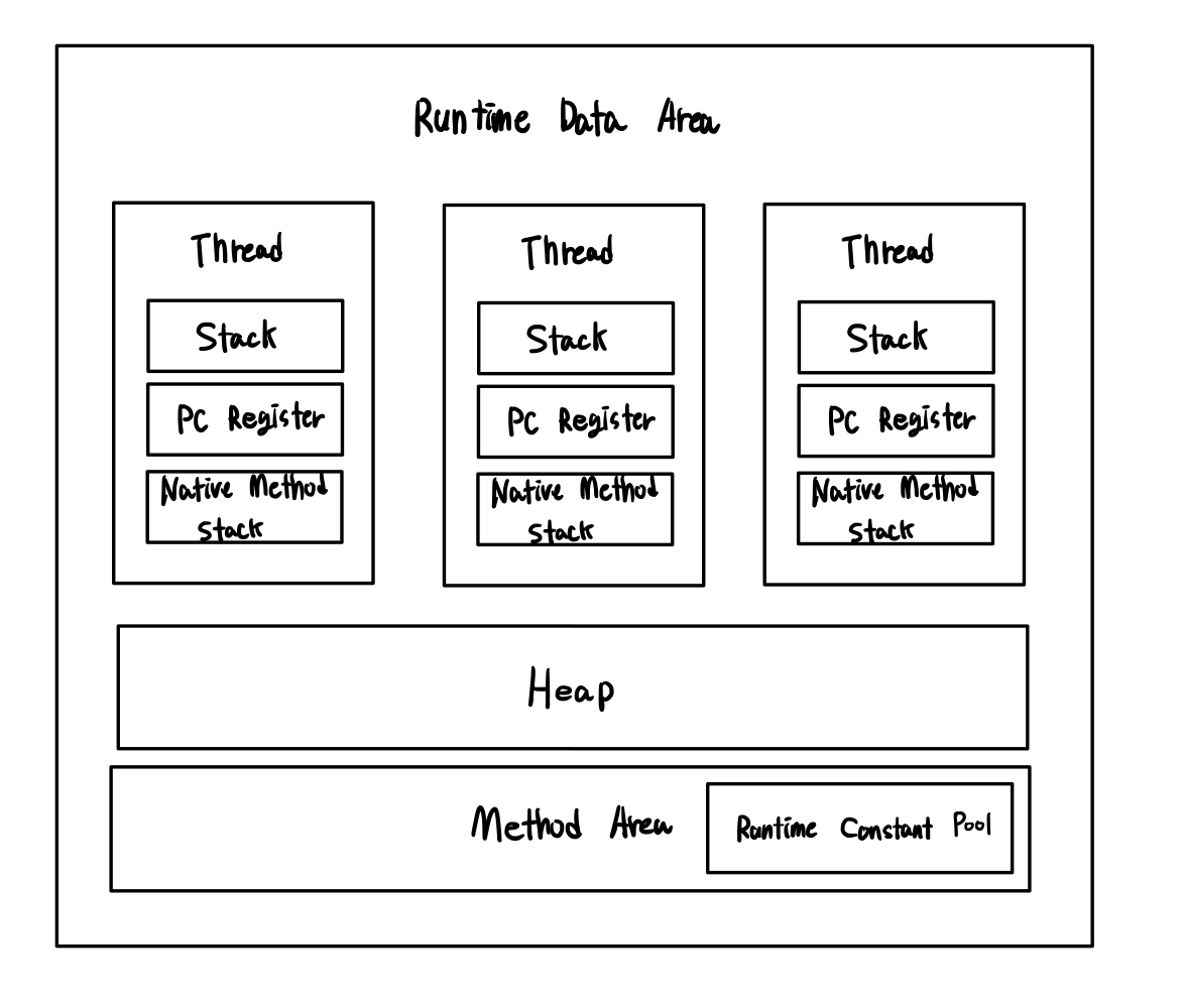 할당받은 메모리를 크게 Method Area, Heap, Stack, PC Register, Native Method Stack로 구분하여 관리한다.