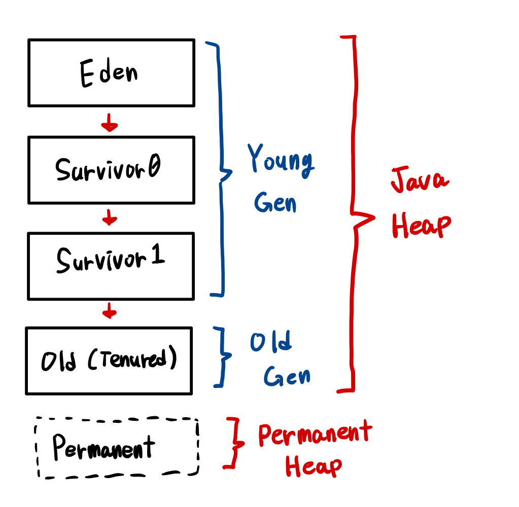 Heap 영역에서 Perm을 같이 보여준 것은 JVM 메모리 개념과 Generation(세대)를 설명하기 위한 것이고, JVM을 구현에서는 Perm은 Java Heap으로 간주하지 않는다. 왜냐하면 최대 힙 사이즈에도 포함되지 않고, Old에서도 승격되지 않기 때문이다. 따라서 별도의 힙 공간이라고 생각하면 된다. (관련자료1)(관련자료2)