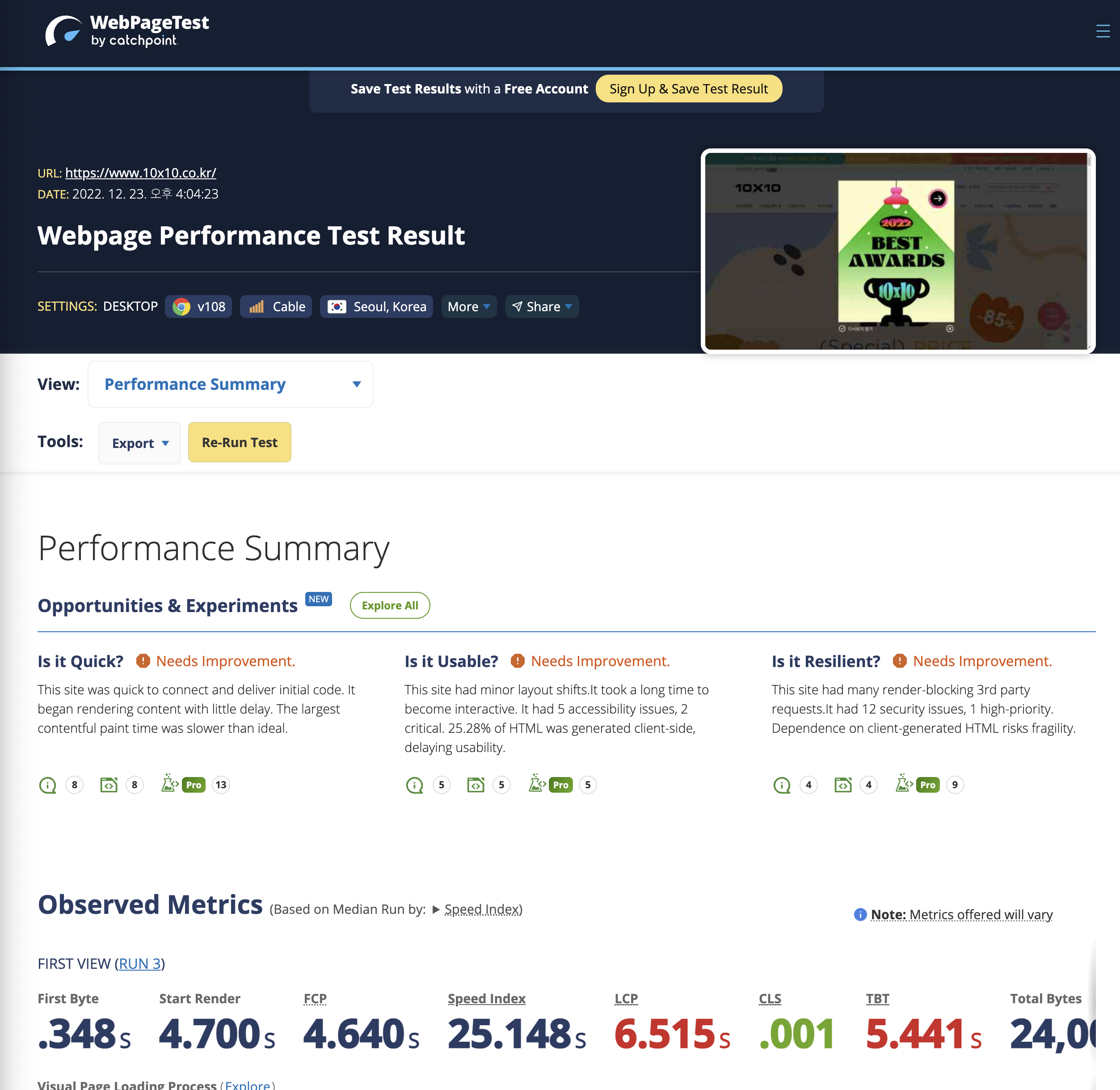 제가 직접 체감했던 시간과 비슷하게 측정되었습니다. 실제로 2초만에 거의 모든 페이지가 확인되었고 TTI 시간대처럼 3초 안에 사용자와 상호작용을 할 수 있었습니다. 지금까지 했던 웹 성능 측정 도구들에게는 개선할 수 있는 부분들을 표시해주는데 여기서는 다음과 같습니다.