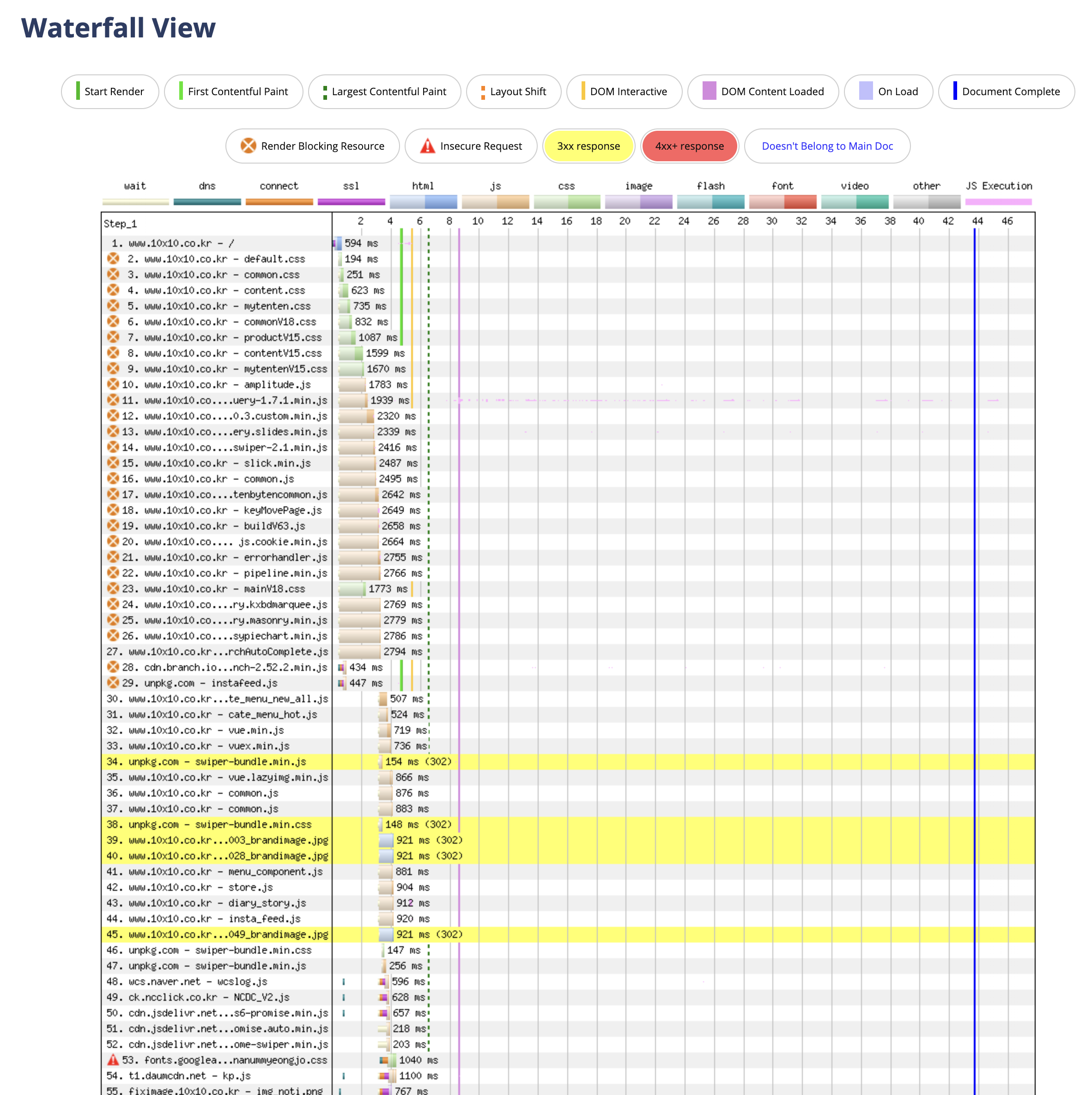 직접 체감한 것 보다 좋지 않게 나왔는데 여기서는 실제 렌더링하는 시간이 5초부터였고 약 43초만에 렌더링이 완료되었다. 이는 첫 5초는 백엔드 부분이고 렌더링을 시작하고 끝나는 시간인 38초는 프론트엔드 관련 최적화가 필요하다는 의미이다. 따라서 웹 성능은 프론트엔드에 의해 좌우됨을 알 수 있는 부분이었다.