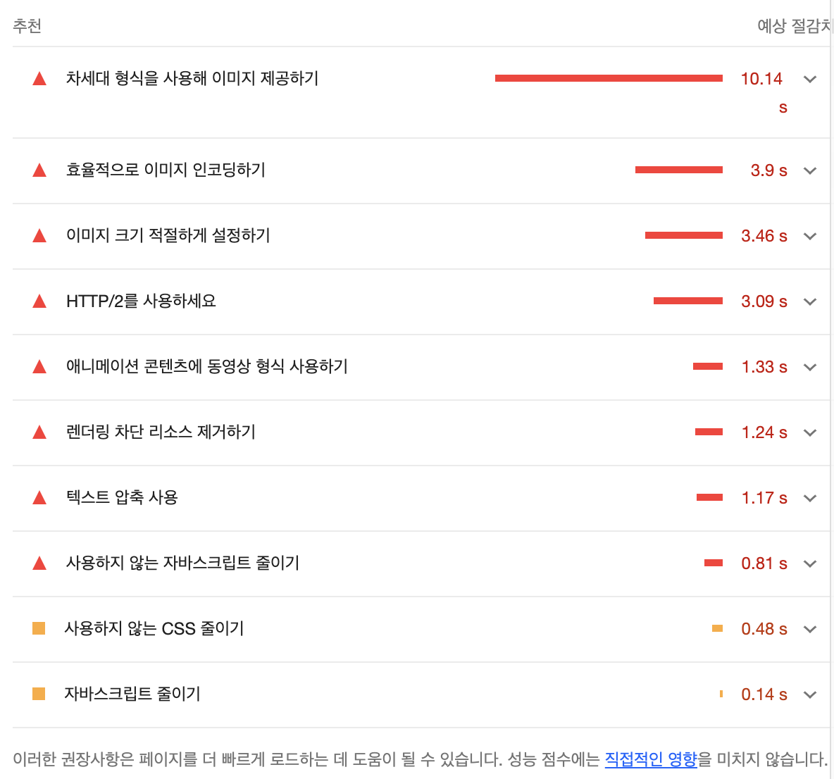 각 추천 방안들을 클릭하면 세부적인 내용들이 나오는데 이를 통해 웹 성능을 개선할 수 있습니다.