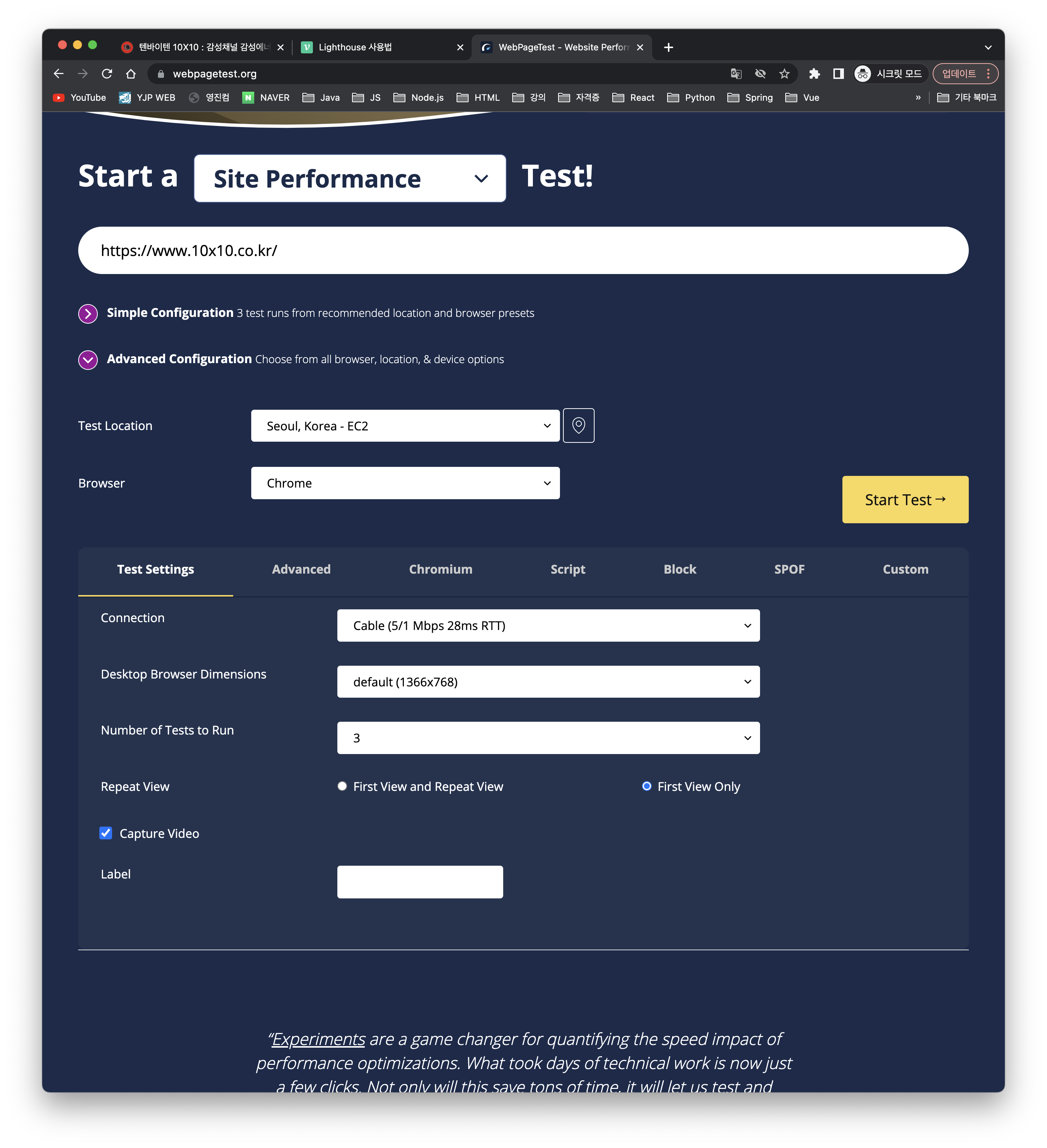 WebPageTest의 좋은점은 여러 옵션을 통해 테스트를 해볼 수 있다는 것이다. 나는 기본값으로만 테스트를 진행해본다. 테스트는 5분 정도 걸리는 것 같다.
