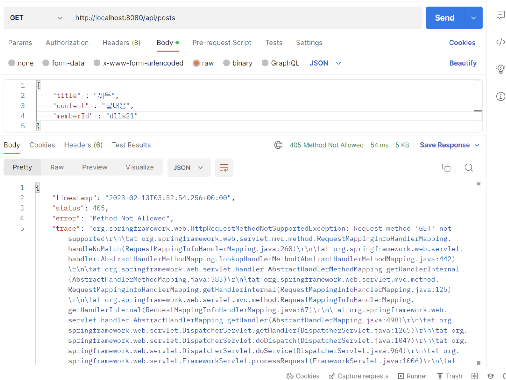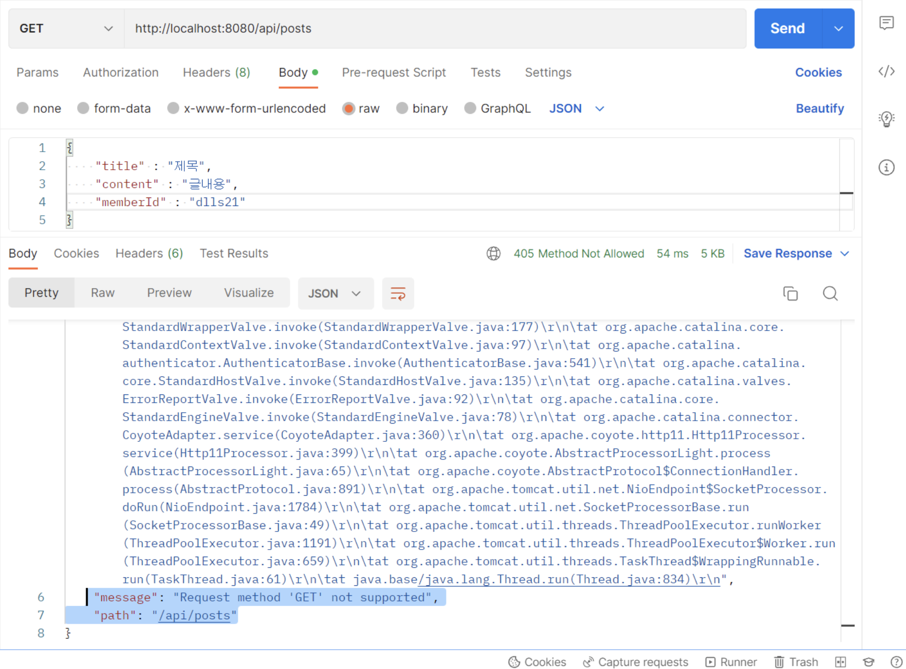 포스트맨의 에러 내용을 살펴보면 HTTP 상태코드 405인 Method Not Allowed이다.