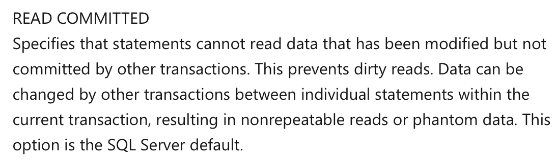 Microsoft SQL Server 2022 (최신버전)은 READ_COMMITTED가 기본 격리 수준이다.
