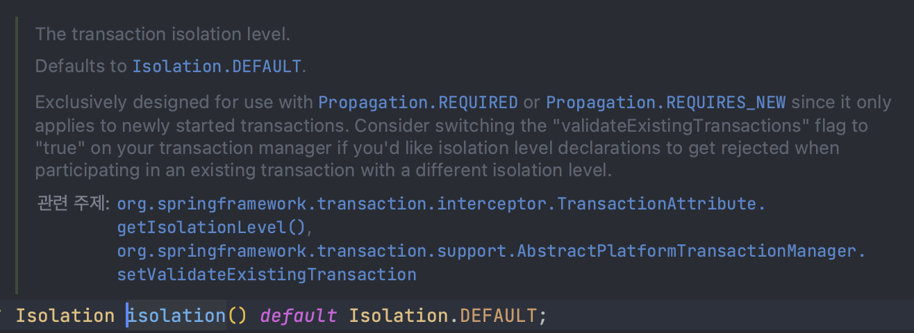 @Transactional의 옵션인 isolation의 기본값은 Isolation.DEFAULT 라고 한다.