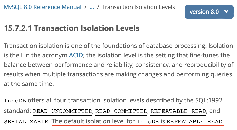 즉, 내가 사용하는 DB의 기본 격리 수준을 따르는 것이기 때문에 각 DB의 기본 격리 수준을 알아보자