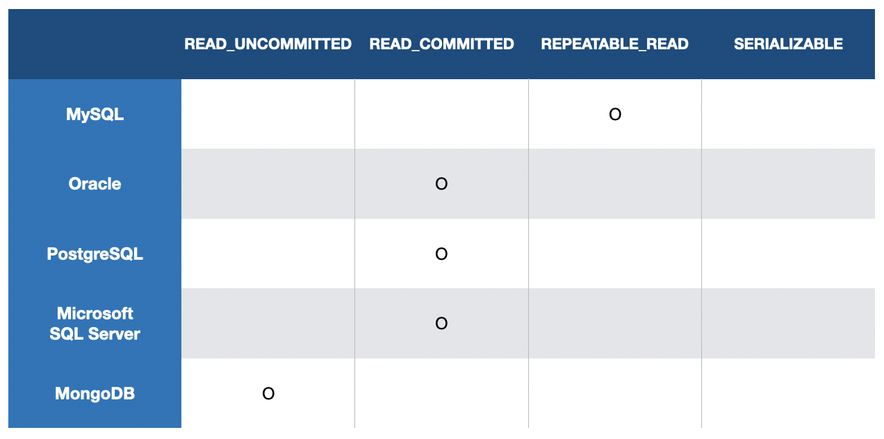 - Oracle, PostgreSQL, Microsoft SQL Server에서 기본 격리 수준