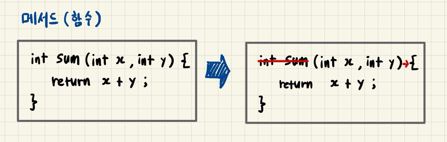 먼저 메서드 이름과 반환 타입을 제거하고 매개변수와 몸통 { } 사이에 -> 를 추가하자.