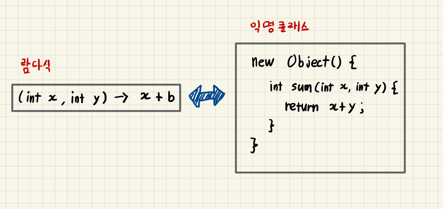 메서드를 람다식으로 표현하면 메서드 이름과 반환값이 없어지므로 익명 함수(anonymous function)라고도 부른다.