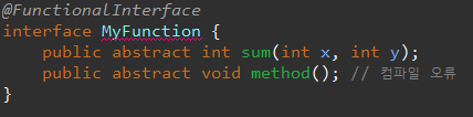 함수형 인터페이스는 2개 이상의 추상 메서드가 되지 않도록 방지하려면 @FunctionallInterface 라는 어노테이션을 붙이면 된다. 이것을 붙였을 때 2개 이상이면 자바 컴파일러가 컴파일 오류를 발생시킨다. 이 어노테이션은 선택사항이지만 실수를 방지하기 위해 달아두면 좋을 것 같다.