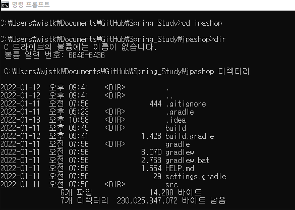 cmd 명령 프롬프트창에서 스프링 프로젝트 파일이 있는 경로로 들어간다.