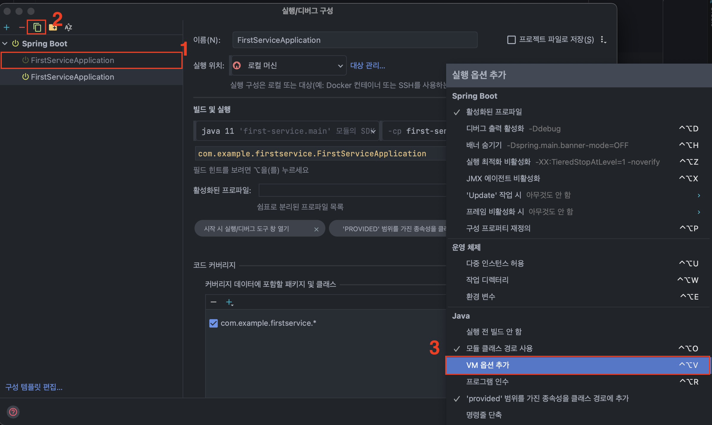 인텔리제이 버전마다 다르지만 내가 사용하는 버전에서는 [옵션 수정] 버튼을 눌려서 VM 옵션을 추가해야 보인다.