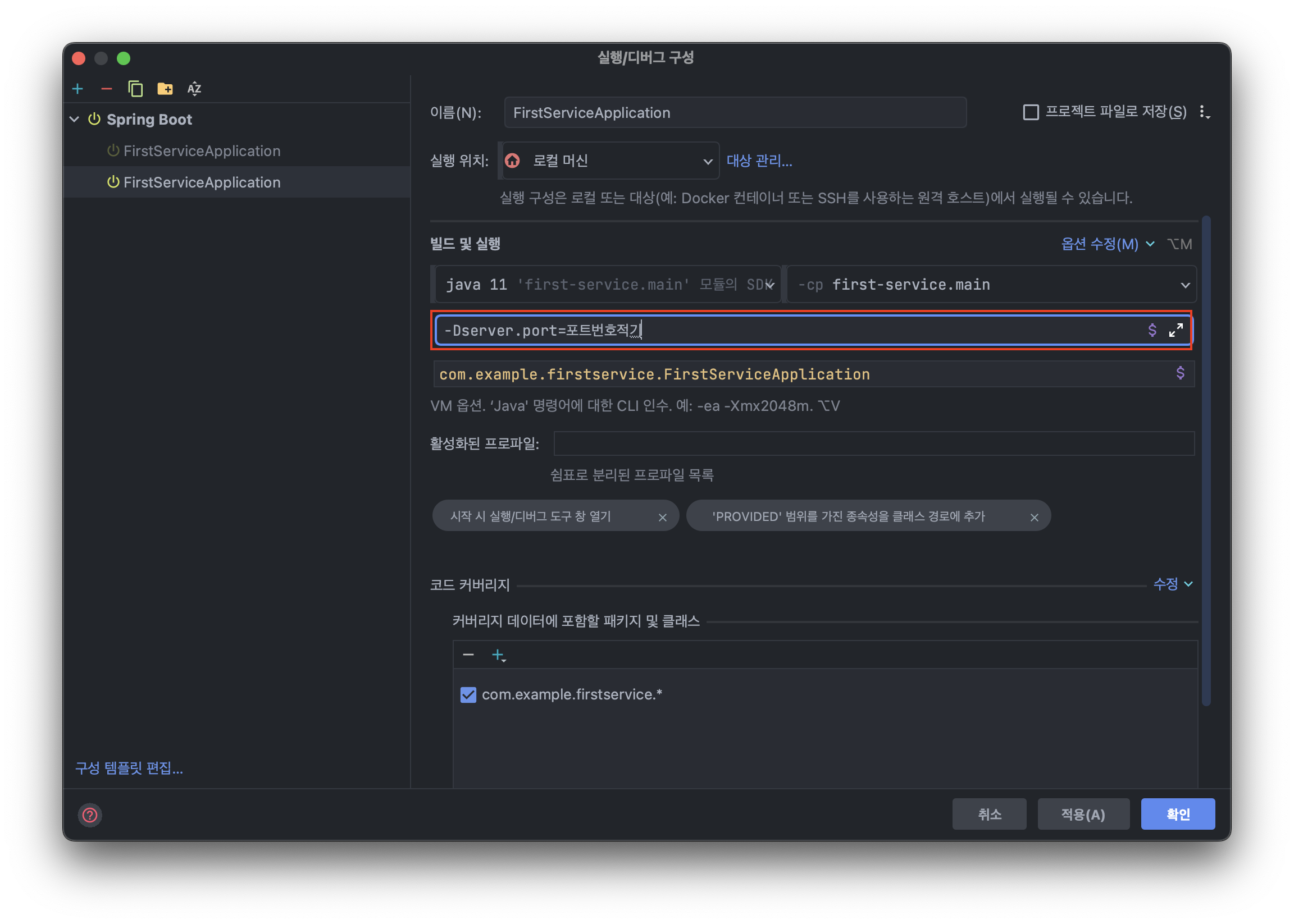 VM 옵션에서 [포트번호적기]에 원하는 포트번호를 적으면 해당 포트번호로 서버가 실행되게 된다.