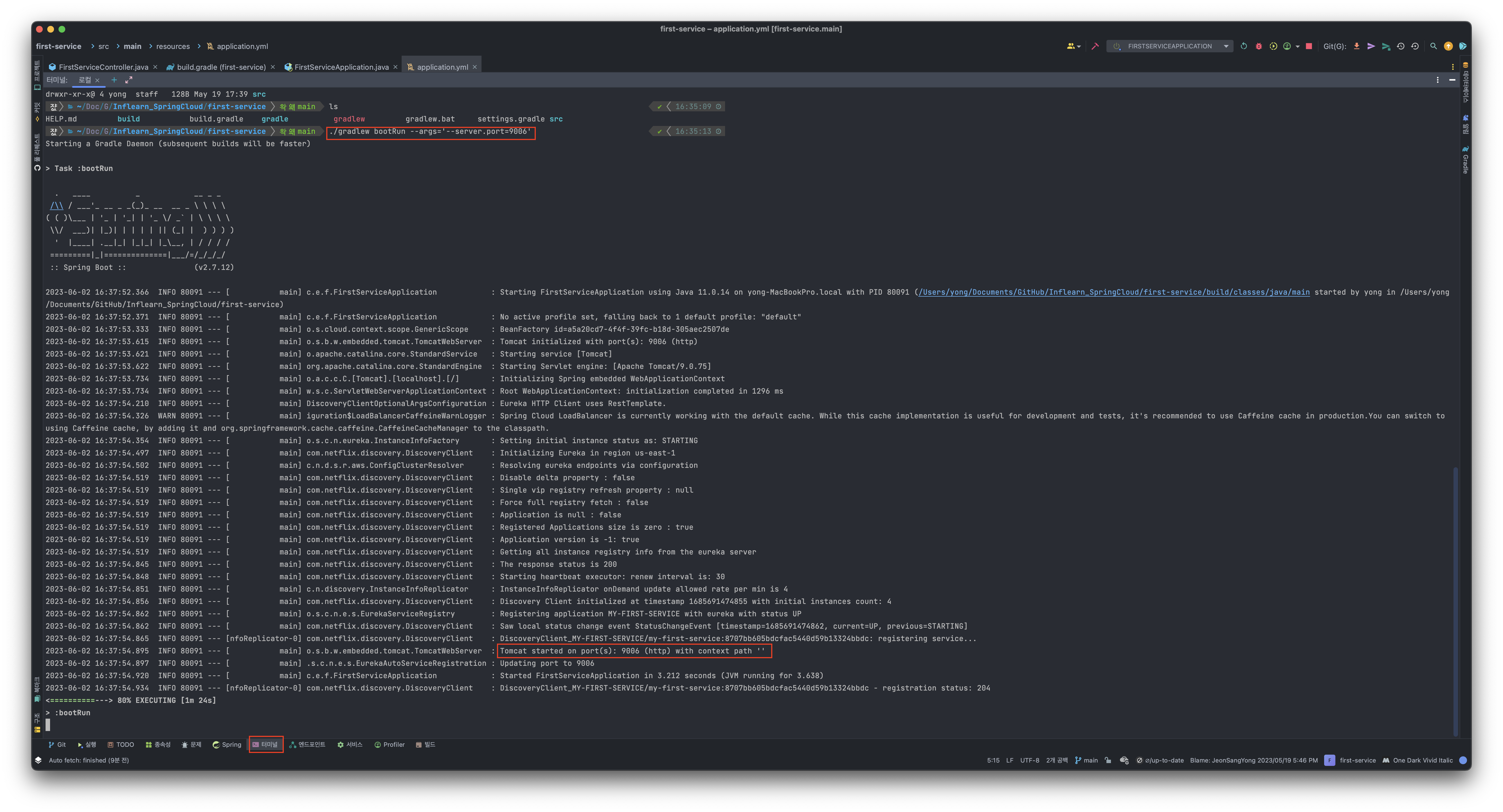 인텔리제이는 터미널을 바로 사용할 수 있으므로 해당 IDE에서 gradlew를 통해 실행시켜본다.