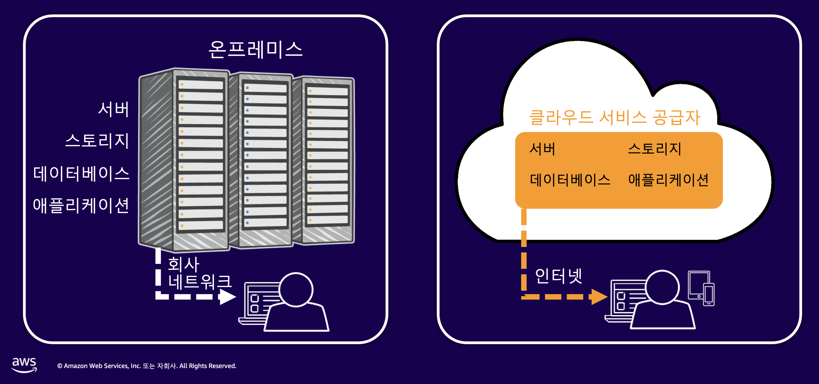 - 온프레미스는 데이터 센터를 직접 구축, 소유, 운영하는 것