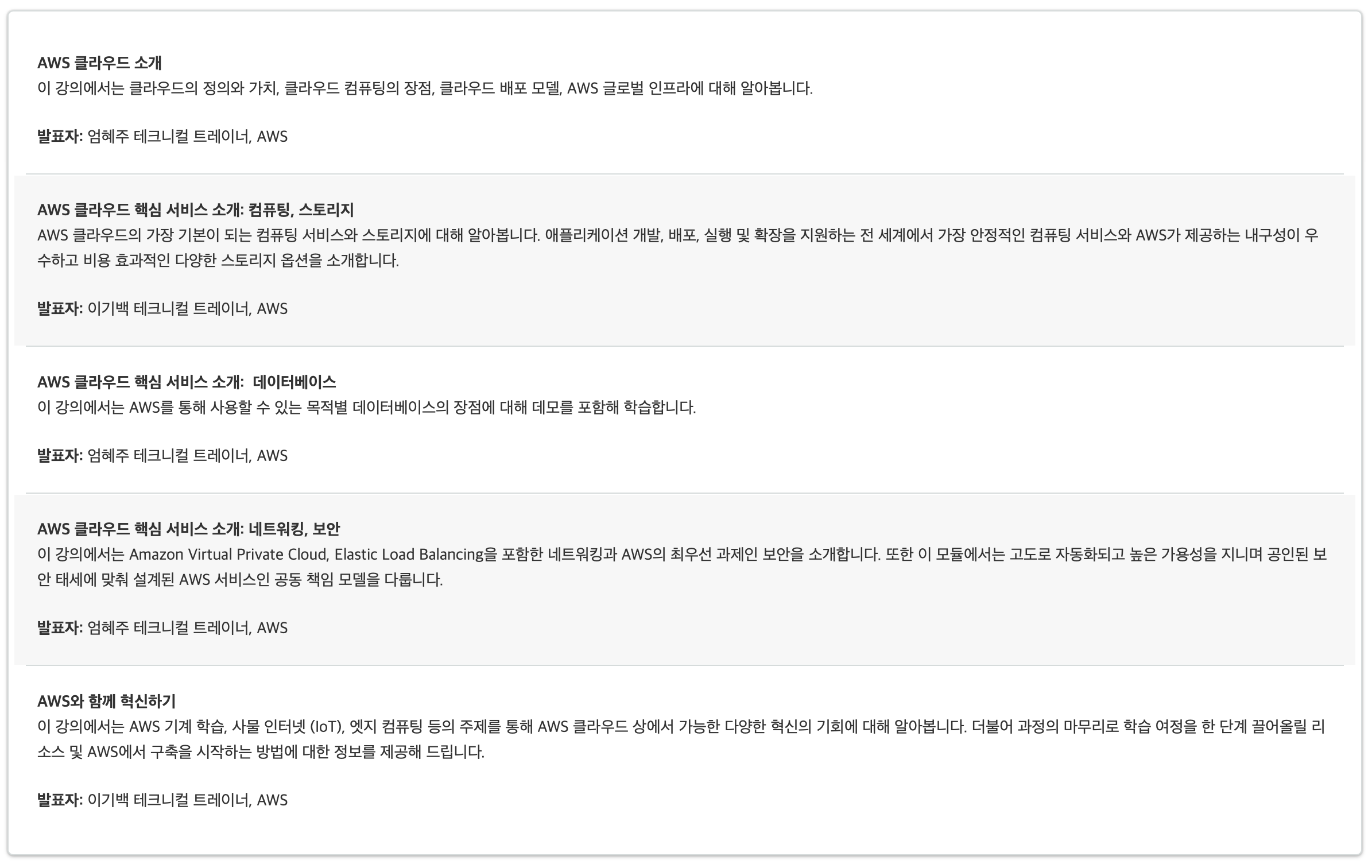 이 중 가장 많은 점유율을 가지고 있는 AWS가 궁금했었는데 마침 AWS 온라인 컨퍼런스 신청을 받고 있길래 냅다 신청하고 들었다. 온라인 강의처럼 3시간동안 듣는 형식이라 큰 부담이 없었다.
