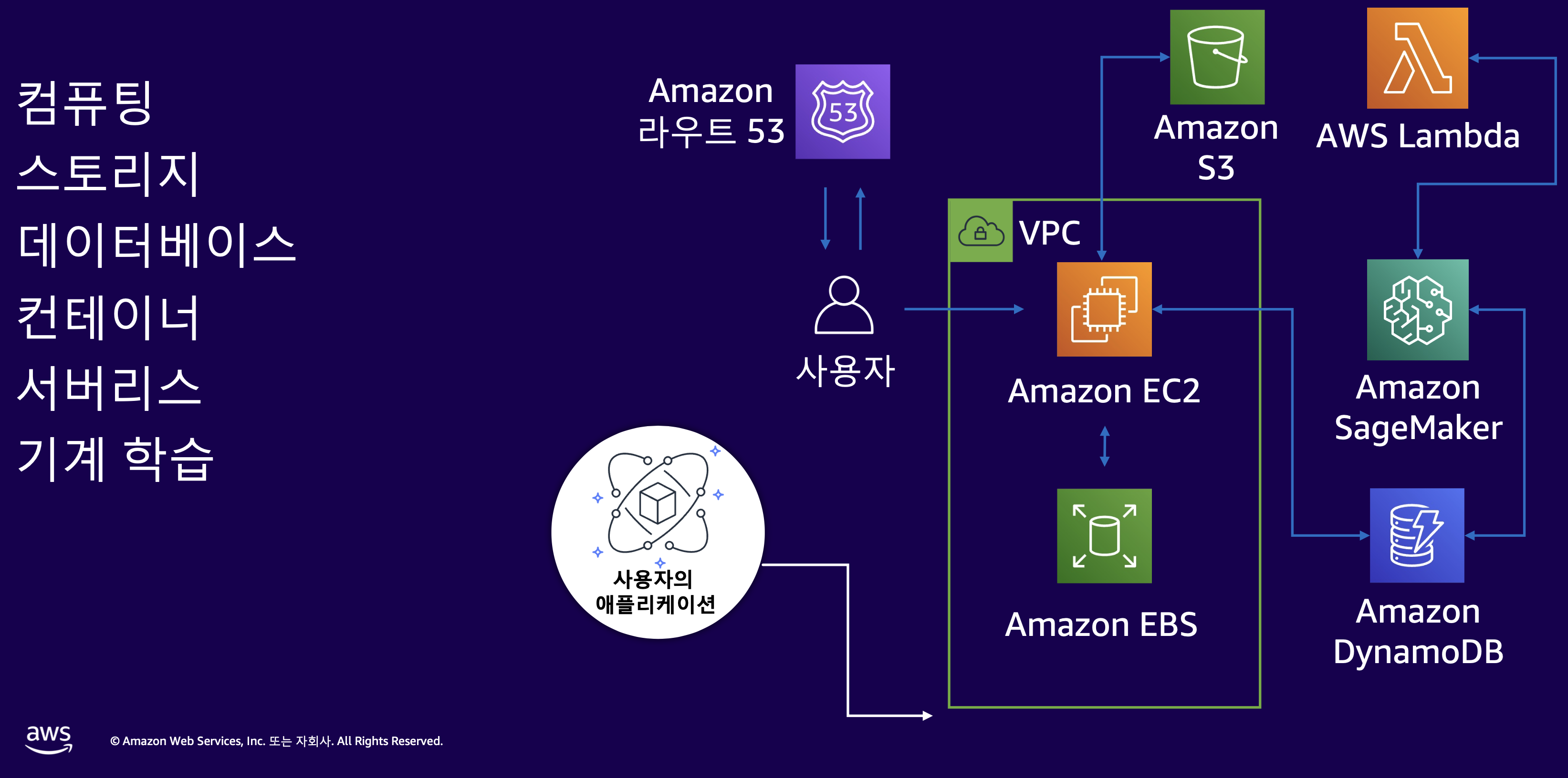 - SageMaker : 기계 학습 모델을 구축, 훈련, 배포하는 완전관리형 서비스