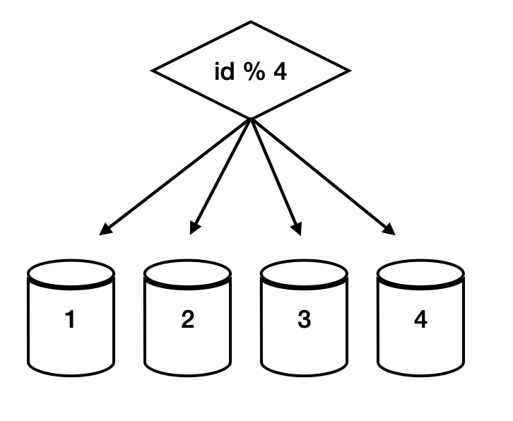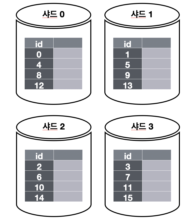 - 위 예시는 id % 4 조건을 해시 함수로 사용하여 데이터가 보관될 샤드를 정함