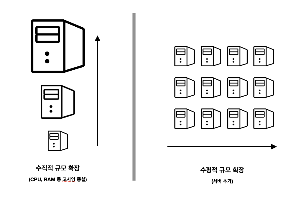 - 기존 서버의 자원(CPU, RAM 등)을 고사양 or 더 많이 증설하는 방법