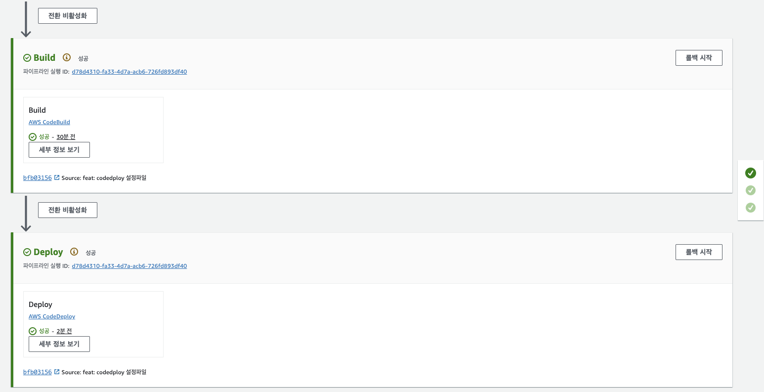 나는 codepipeline의 source를 Github 개인 리포지토리로 연결했기에 수정된 사항을 main에 push하면 자동으로 파이프라인이 동작하게 되어 CI/CD가 자동화되는 것이다. 설정하는 단계에서는 복잡했지만 만들고나면 엄청나게 편하다는 것을 느끼게 된다.