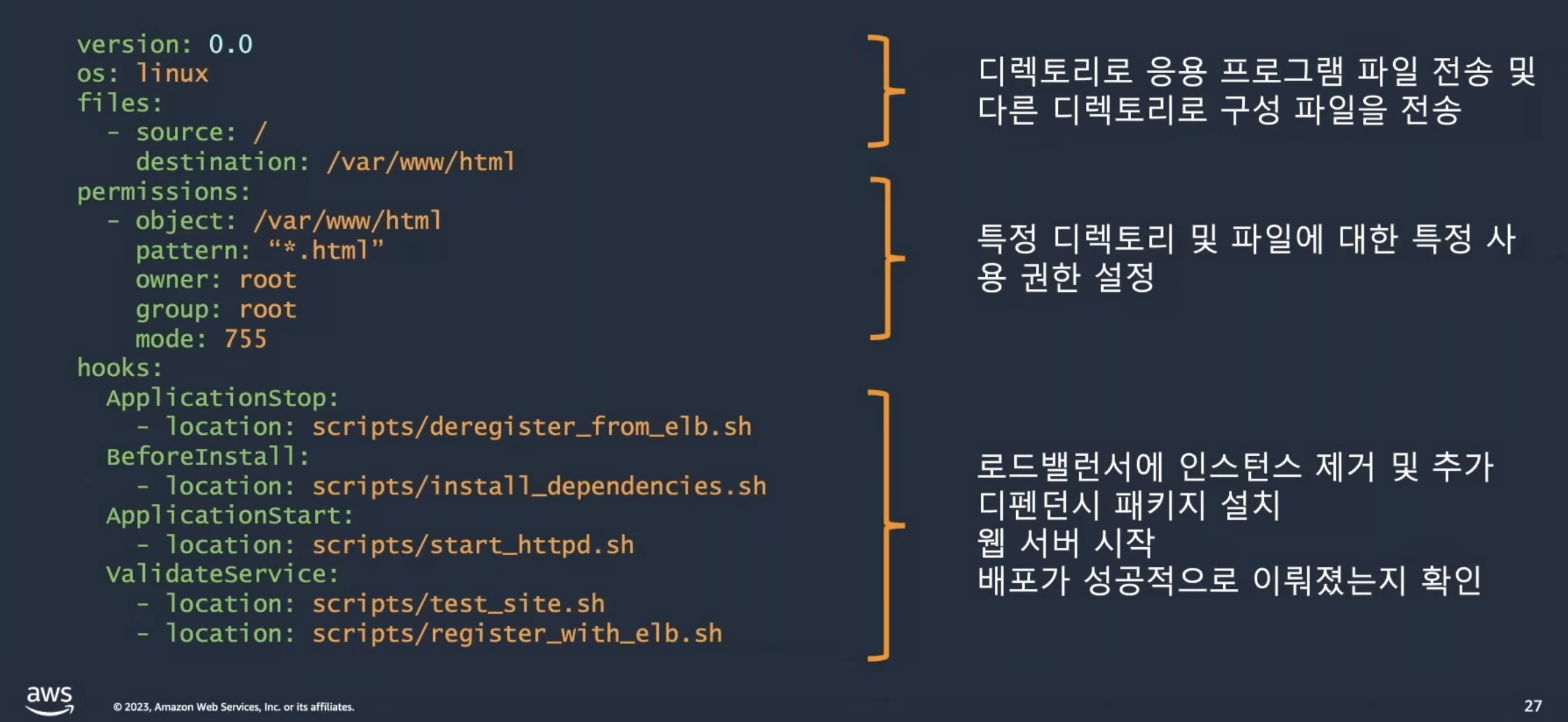 AWS 공식문서 - CodeDeploy 애플리케이션 사양 (AppSpec) 파일 을 참고하면 좋다.