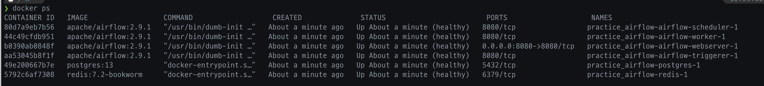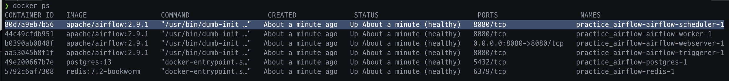 1. `docker ps` 실행하여 airflow-scheduler-1 의 CONTAINER ID 를 추출한다. 아래 이미지에서는 80d7a9eb7b56 이다.