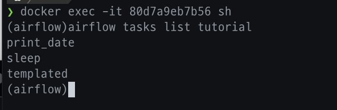 2. Container ID ("80d7a9eb7b56")로 `docker exec -it 80d7a9eb7b56 sh` 를 실행하면 쉘 모드로 들어갈 수 있고, 거기서 airflow 명령어를 실행할 수 있다.