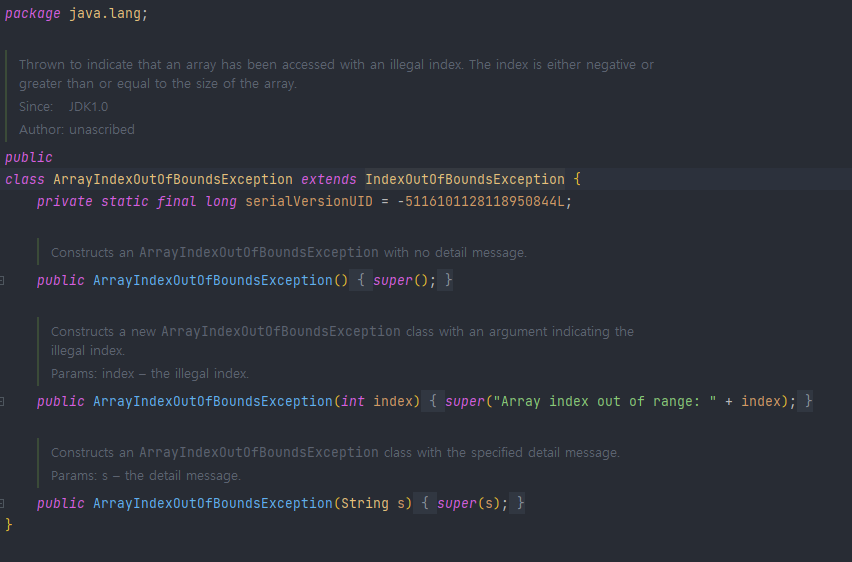 💻 IDE에 ArrayIndexOutOfBoundsException 클래스를 들어가면 다음과 같이 적혀있다.