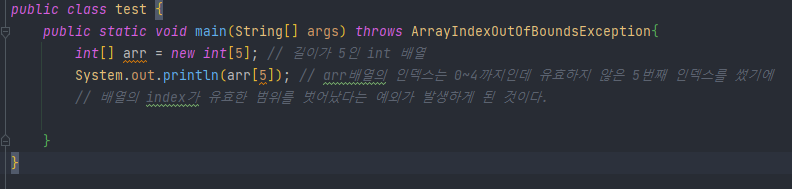 arr배열의 인덱스가 유효한 범위인 0~4를 벗어났기에 예외가 발생한 것이다.