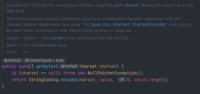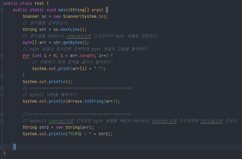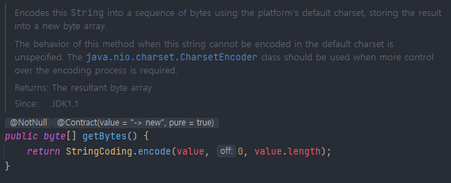 즉, 우리가 사용하는 IDE의 default charset을 사용하여 문자열을 byte로 인코딩하여 byte 배열에 넣어서 반환해준다는 말이다.